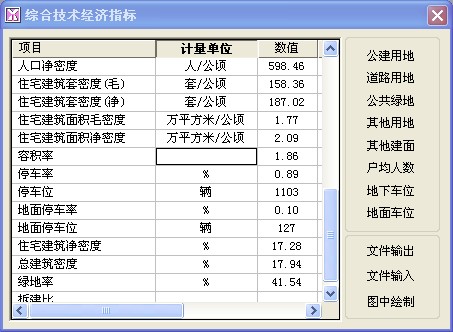 本软件能自动统计总建筑面积、总建筑基底面积、总绿地面积、总铺地面积、总造价、总户数、停车场个数、树种个数等,能自动计算容积率、建筑密度、绿地率等指标。可以生成建筑情况一览表、苗木表等。